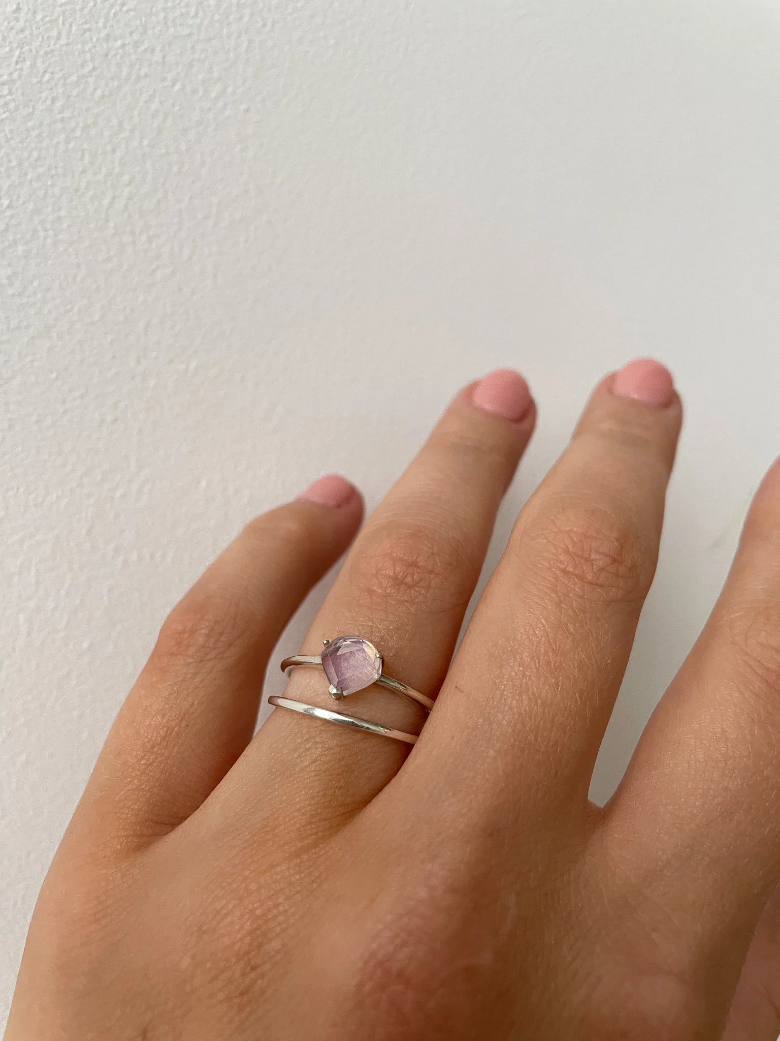 The unusual cut/ shape of our fan cut ring allows the hues of Lavender Quartz to strike through the stone as light hits. Lavender quartz has beautiful purple/pink hues strike through the stone as it hits light at all angles, unlike moonstone, lavender quartz has a much more translucent appearance.